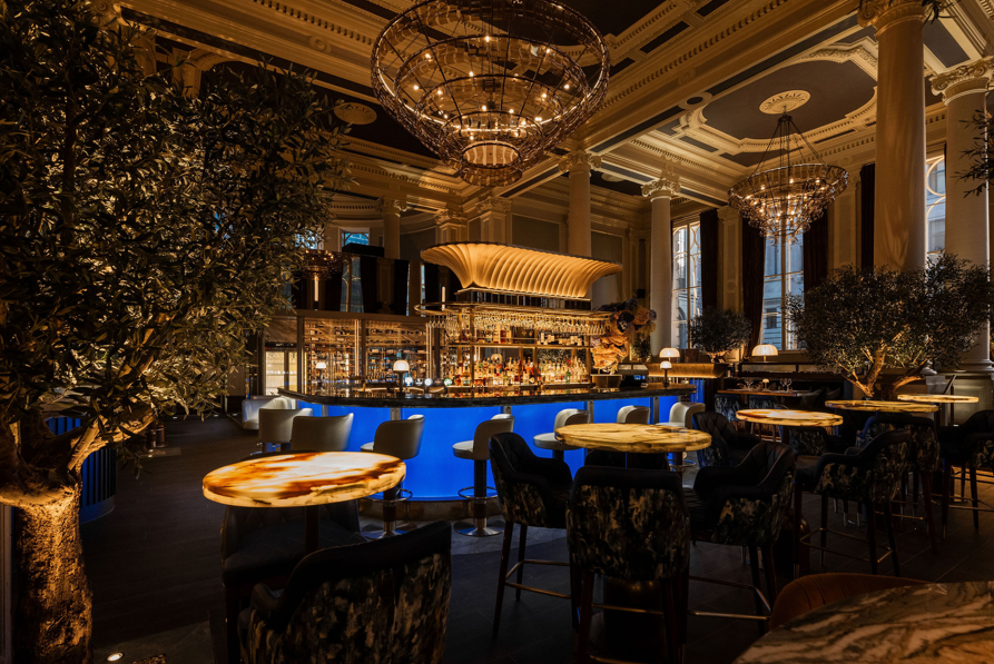 To complement the restaurant’s striking interiors – from the soaring 28-foot ceilings and decorative plasterwork to the polished brass gantries and glowing bar centrepiece – the architectural lighting was designed and specified by Mistry Lighting, with all fixtures supplied by Lucent Lighting.